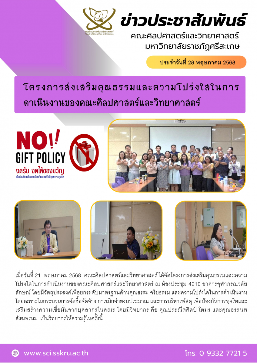เมื่อวันที่ 21 พฤษภาคม 2568 คณะศิลปศาสตร์และวิทยาศาสตร์ ได้จัดโครงการส่งเสริมคุณธรรมและความโปร่งใสในการดำเนินงานของคณะศิลปศาสตร์และวิทยาศาสตร์ ณ ห้องประชุม 4210 อาคารจุฬาภรณวลัยลักษณ์ โดยมีวัตถุประสงค์เพื่อยกระดับมาตรฐานด้านคุณธรรม จริยธรรม และความโปร่งใสในการดำเนินงาน โดยเฉพาะในกระบวนการจัดซื้อจัดจ้าง การเบิกจ่ายงบประมาณ และการบริหารพัสดุ เพื่อป้องกันการทุจริตและเสริมสร้างความเชื่อมั่นจากบุคลากรในคณะ โดยมีวิทยากร คือ คุณศรีสุดา จันทร และคุณอรรนพ สังฆพรหม เป็นวิทยากรให้ความรู้ในครั้งนี้